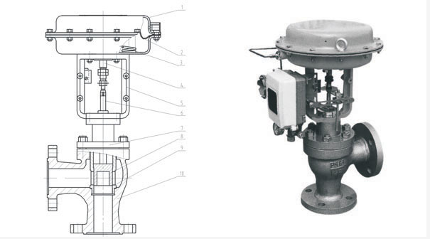 1、膜蓋2、膜片3、彈簧4、推桿5、支架6、閥桿 7、閥蓋8、閥芯9、套筒 10、閥體