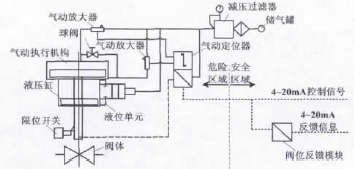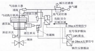 圖2 電氣定位器控制原理圖 3 現(xiàn)有調(diào)節(jié)閥安全模式 3.1 方案分析 氣動調(diào)節(jié)閥實現(xiàn)了出站壓力的調(diào)節(jié)控制,電氣定位器能夠使其在全行程上進(jìn)行移動。執(zhí)行機(jī)構(gòu)可以連續(xù)地做增壓或者減壓的調(diào)整,以達(dá)到較好的控制效果。但調(diào)節(jié)閥執(zhí)行機(jī)構(gòu)存在故障狀態(tài)下安全模式選擇的問題。安全模式的選擇首先要保證生產(chǎn)的安全性,其次是生產(chǎn)的連續(xù)性。由于長輸管道的特殊性,要求當(dāng)調(diào)節(jié)閥出現(xiàn)故障時,調(diào)節(jié)閥處于保位狀態(tài)。 3.2 保位措施 調(diào)節(jié)閥的故障狀態(tài)有斷氣、斷電和斷信號三類。 在斷氣故障狀態(tài),連接到液壓單元的氣壓信號中斷,液壓單元的內(nèi)部液壓油路被關(guān)閉。由于液體是不可以壓縮的,液壓缸內(nèi)的閥桿無法移動,因此執(zhí)行機(jī)構(gòu)被鎖定,實現(xiàn)保位功能。由于供氣管線安裝有壓力變送器,當(dāng)調(diào)節(jié)閥出現(xiàn)斷氣故障時,站控制系統(tǒng)發(fā)出氣源壓力低報警信號,提醒工作人員及時處理并檢查調(diào)節(jié)閥狀態(tài)信息。 在斷電故障狀態(tài),由于控制系統(tǒng)電源采用在線式不間斷電源(UPS)供電,且后備電池時間為2h,因此調(diào)節(jié)閥不考慮斷電時的保位措施。 在斷信號故障狀態(tài),DVC6010無法切斷液壓單元的氣壓信號,因此無法實現(xiàn)保位功能。 4 改造后調(diào)節(jié)閥安全模式 針對斷信號故障狀態(tài)下無法實現(xiàn)保位功能的問題,對調(diào)節(jié)閥執(zhí)行機(jī)構(gòu)進(jìn)行改造。在電氣定位器和執(zhí)行機(jī)構(gòu)之間加裝電磁閥,控制室增加信號保護(hù)模塊,實現(xiàn)調(diào)節(jié)閥斷信號保位功能。改造后調(diào)節(jié)閥控制原理圖如圖3所示。