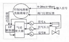 圖1 調(diào)節(jié)閥控制原理圖 2.2 電氣定位器控制原理 FISHERDVC6010電氣定位器是基于微處理器將電信號轉(zhuǎn)換成氣動信號的儀表。微處理器將給定值與閥門形成的反饋值進(jìn)行比較,當(dāng)出現(xiàn)偏差時,微處理器依據(jù)偏差的大小和方向輸出一個驅(qū)動信號。該驅(qū)動信號通過電氣(I/P)轉(zhuǎn)換器,將電信號轉(zhuǎn)換成氣動信號,再通過氣動放大器放大,按照位置方向輸出給氣動執(zhí)行機(jī)構(gòu)。執(zhí)行機(jī)構(gòu)依據(jù)接收的信號A或者信號B進(jìn)行上下移動,從而使閥門開度在全行程上進(jìn)行移動。電氣定位器控制原理圖如圖2所示。